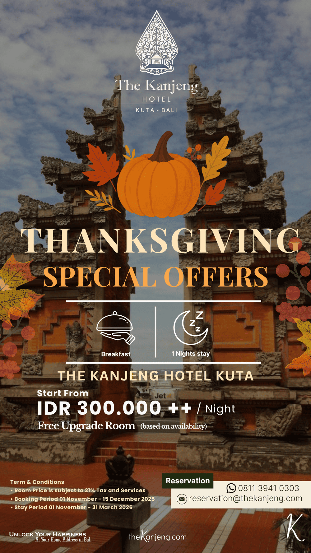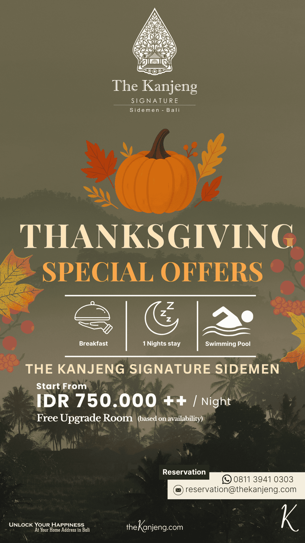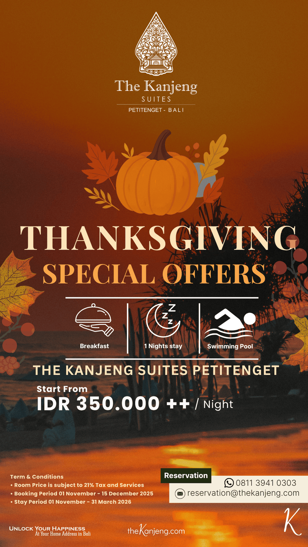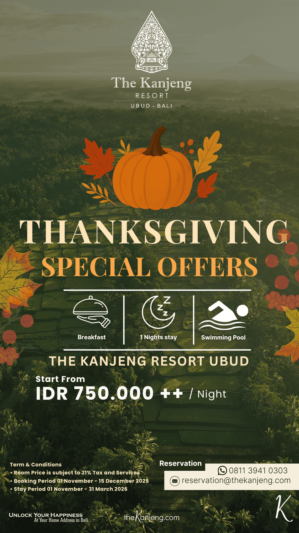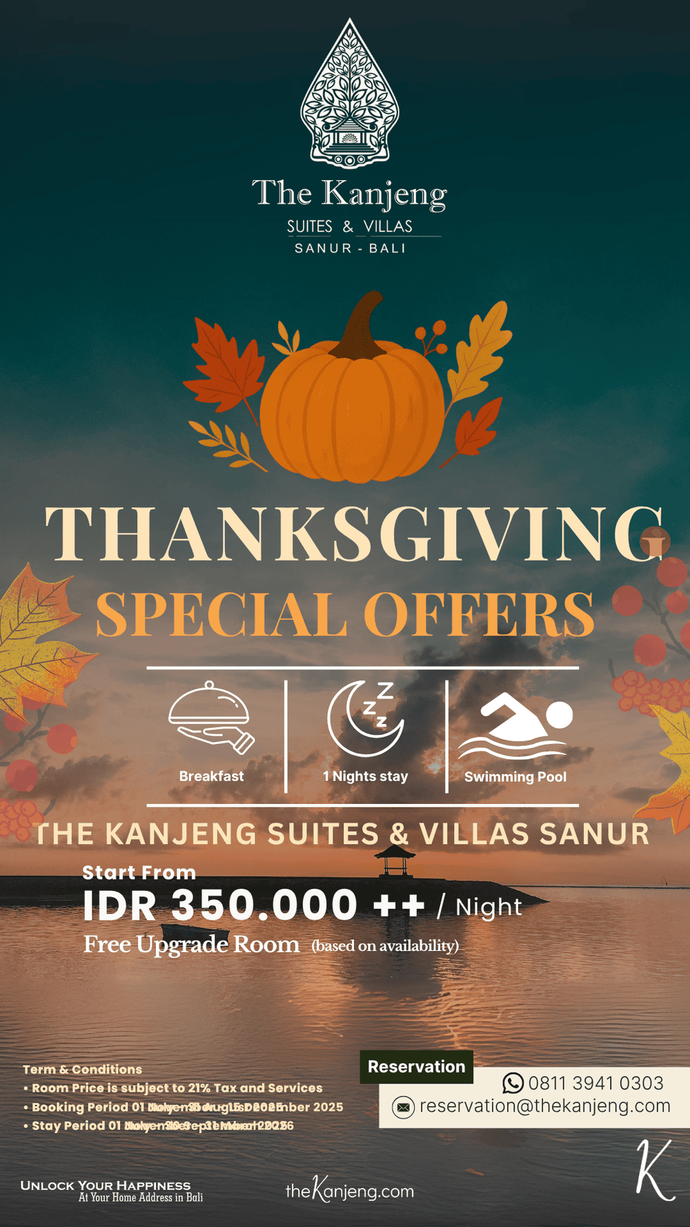 This Thanksgiving, embrace a celebration of togetherness and gratitude across Bali’s most beloved destinations. From the lively charm of Kuta , the calming coastline of relaxation in Sanur, and the stylish journey at Petitenget, to the cultural heartbeat in Ubud and the serene valleys of Sidemen, The Kanjeng Indonesia invites you to rediscover Bali with fresh eyes and an open heart.